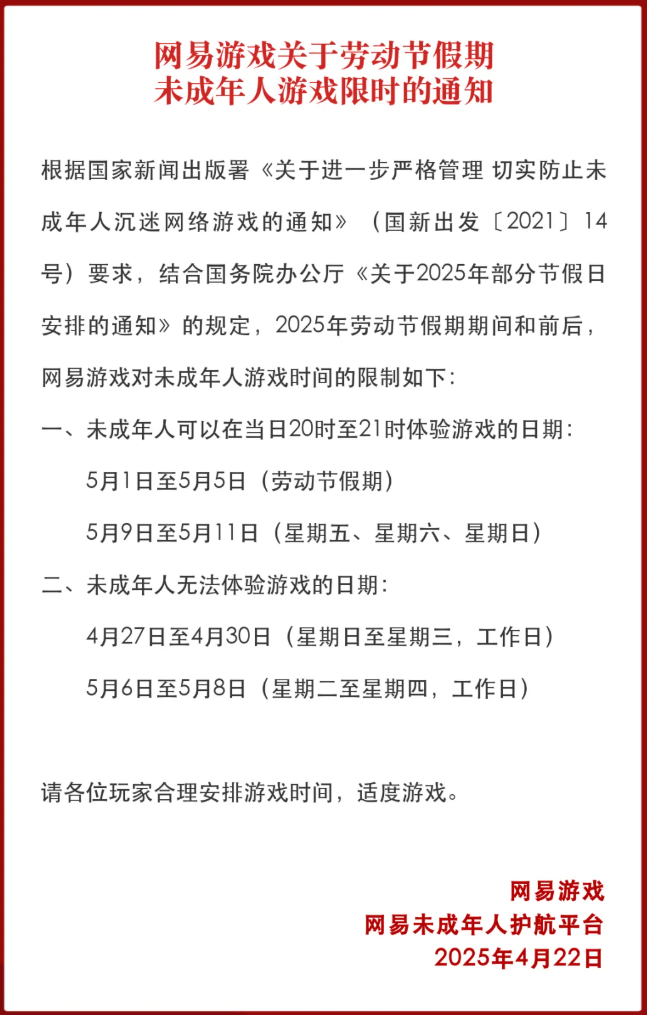 ● 4月22日,网易游戏发布劳动节假期未成年人游戏限时通知。