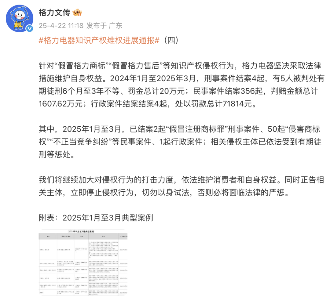 ● 4月22日,格力最新通报:5人被判处有期徒刑6个月至3年不等。详情>>