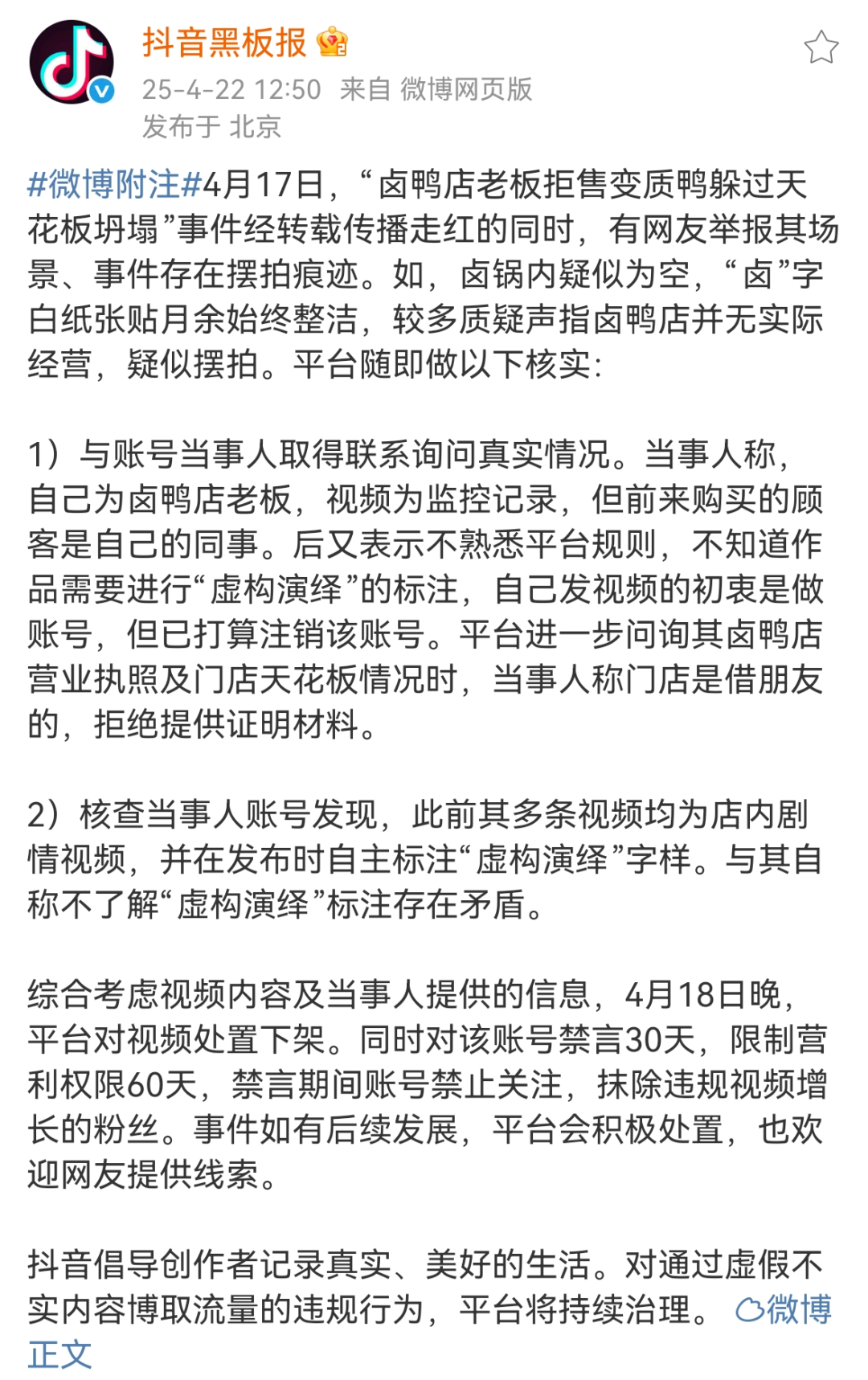● 4月22日,据@抖音黑板报通报:“卤鸭店老板拒售变质鸭躲过天花板坍塌”事件确认系摆拍。详情>>