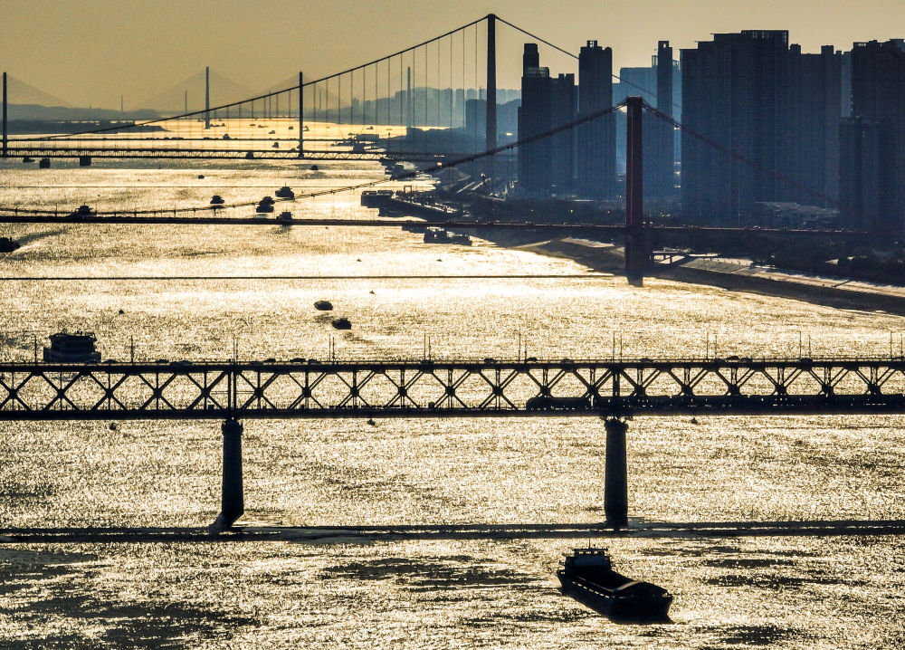 2024年1月23日,一列火车从武汉长江大桥上驶过(无人机照片)。