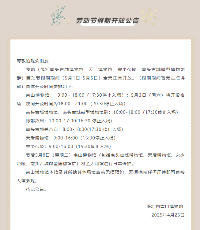 ● 南山:南山博物馆发布劳动节假期开放公告。