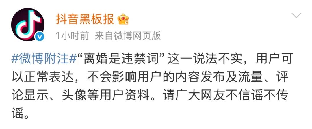 ● “离婚”是违禁词?抖音回应:这一说法不实,用户可以正常表达,不会影响用户的内容发布及流量、评论显示、头像等用户资料。