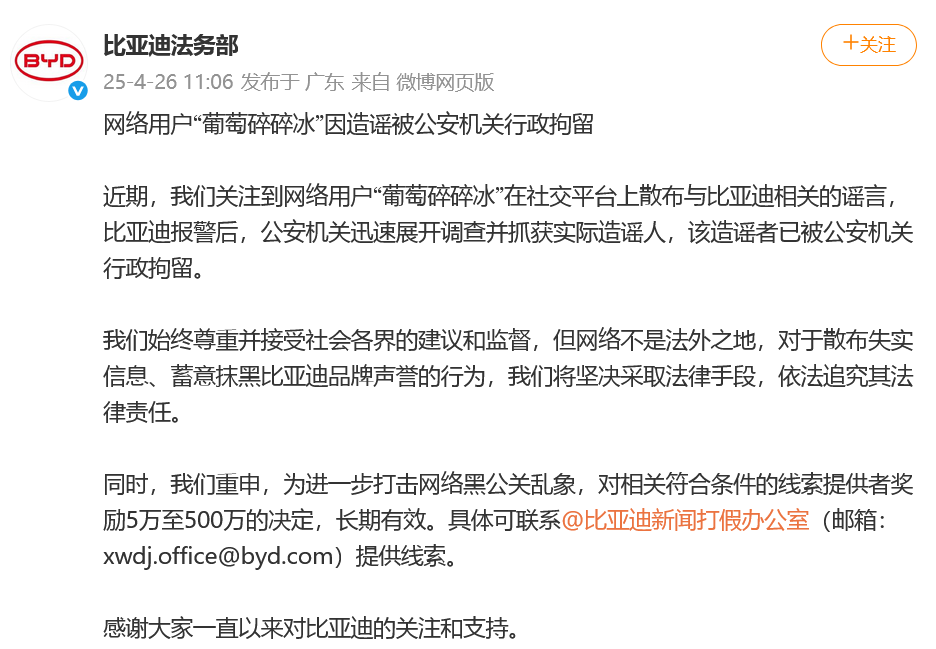 ● 网民造谣“比亚迪充电爆炸”被行拘,比亚迪:奖励5万至500万打击网络黑公关乱象。