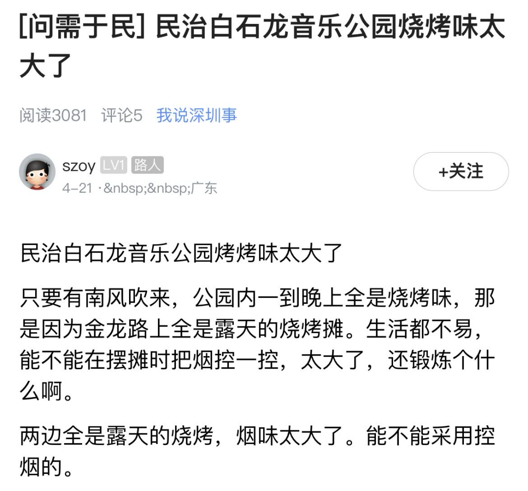 只要有南风吹来,公园内一到晚上全是烧烤味,那是因为金龙路上全是露天的烧烤摊。生活都不易能不能在摆摊时把烟控一控,太大了,还锻炼个什么啊。