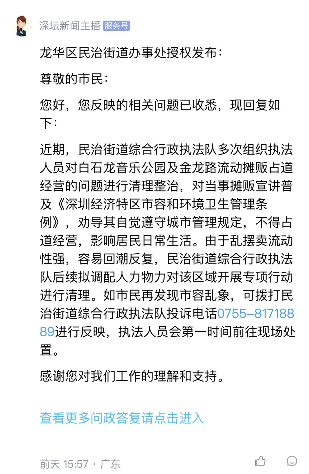 近期,民治街道综合行政执法队多次组织执法人员对白石龙音乐公园及金龙路流动摊贩占道经营的问题进行清理整治,对当事摊贩宣讲普及《深圳经济特区市容和环境卫生管理条例》,劝导其自觉遵守城市管理规定,不得占道经营,影响居民日常生活。由于乱摆卖流动性强,容易回潮反复,民治街道综合行政执法队后续拟调配人力物力对该区域开展专项行动进行清理。如市民再发现市容乱象,可拨打民治街道综合行政执法队投诉电话0755-81718889进行反映,执法人员会第一时间前往现场处置。