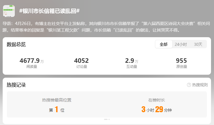 4月26日,有网友在社交平台发帖称,其向银川市市长信箱举报“第六届西夏区诗词大会决赛”相关问题,回复却是“银川某工程欠款”问题。