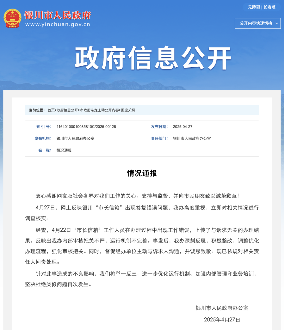 4月27日,银川市政府办公室发布情况通报,向市民致歉。
