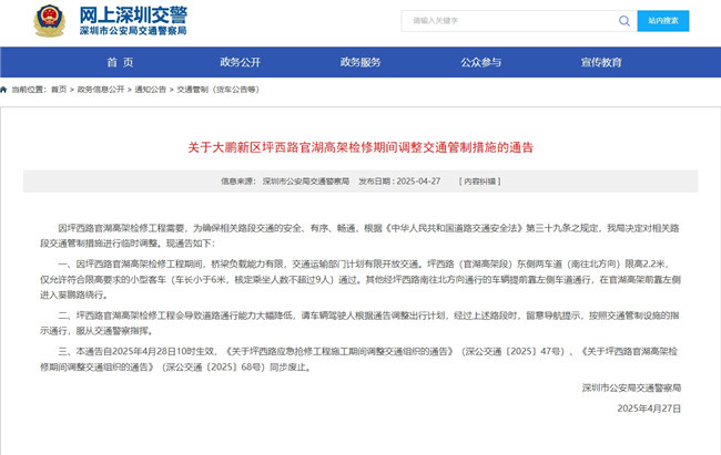 深圳新闻网2025年4月28日讯(记者 周维朕)因坪西路官湖高架检修工程需要,为确保相关路段交通的安全、有序、畅通,根据《中华人民共和国道路交通安全法》第三十九条之规定,我局决定对相关路段交通管制措施进行临时调整。现通告如下: