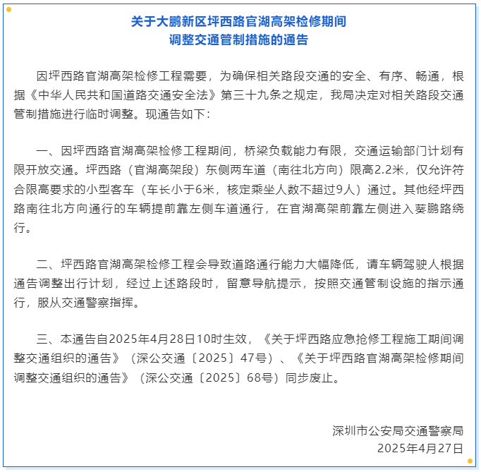 ● 大鹏:4月27日,深圳交警发布关于大鹏新区坪西路官湖高架检修期间调整交通管制措施的通告。