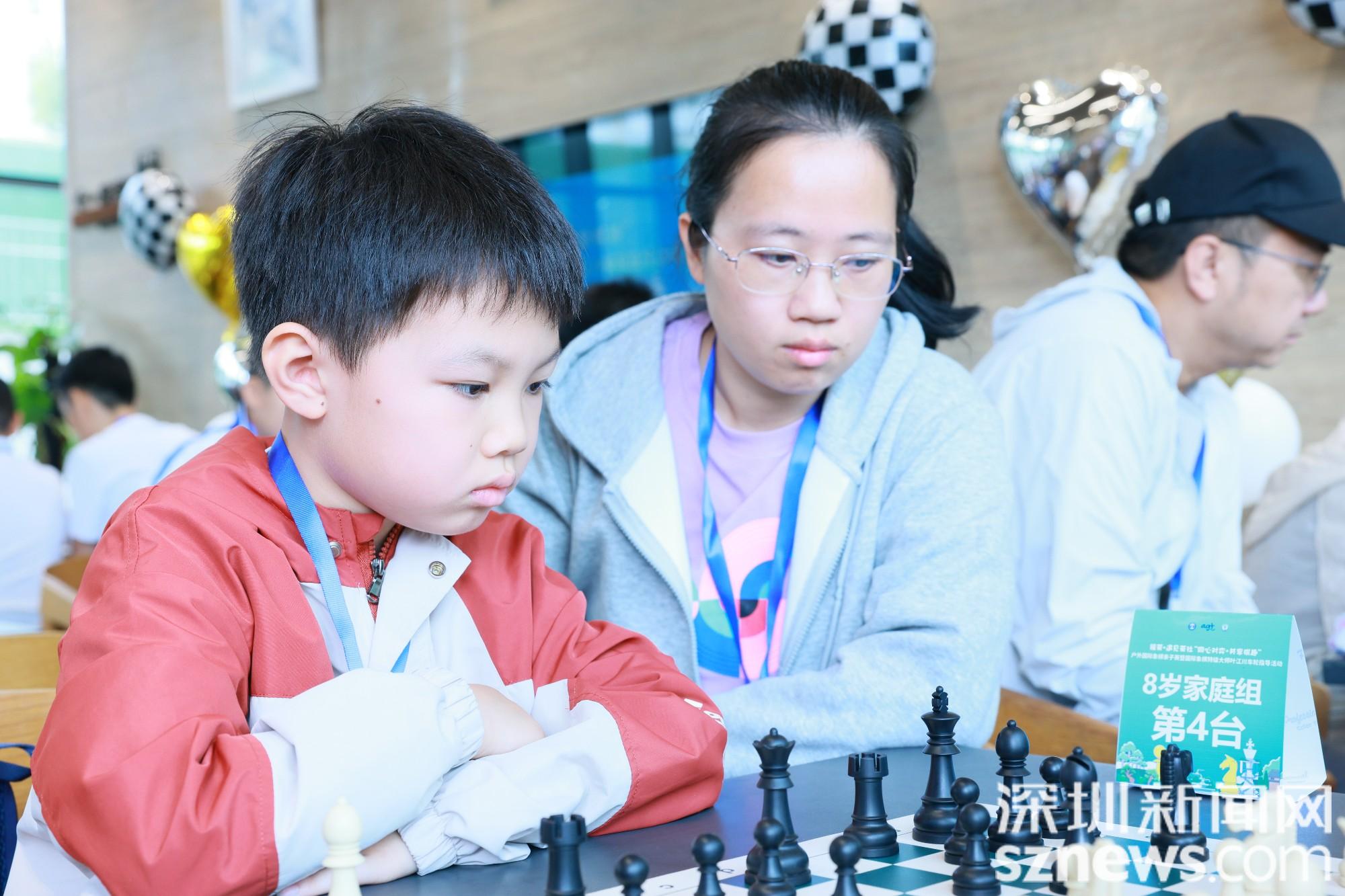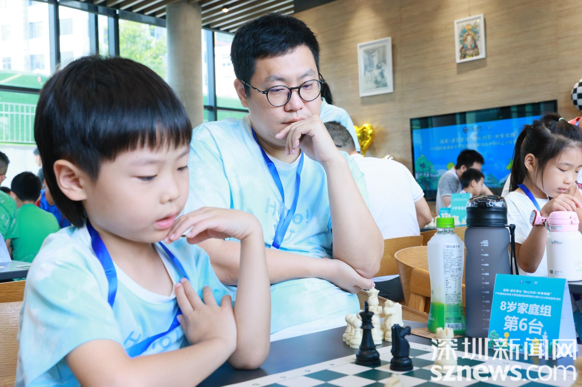 比赛共有32组家庭参加,8岁组家庭与10岁组家庭分为两个组别。赛场上,家长与孩子身着精心搭配的同色系亲子装,并肩而坐,共同思索棋局,时而轻声讨论,时而默契点头。大手与小手在棋盘上交替落下棋子,“并肩作战”的温馨画面,让整个赛场洋溢着浓厚的亲子温情。