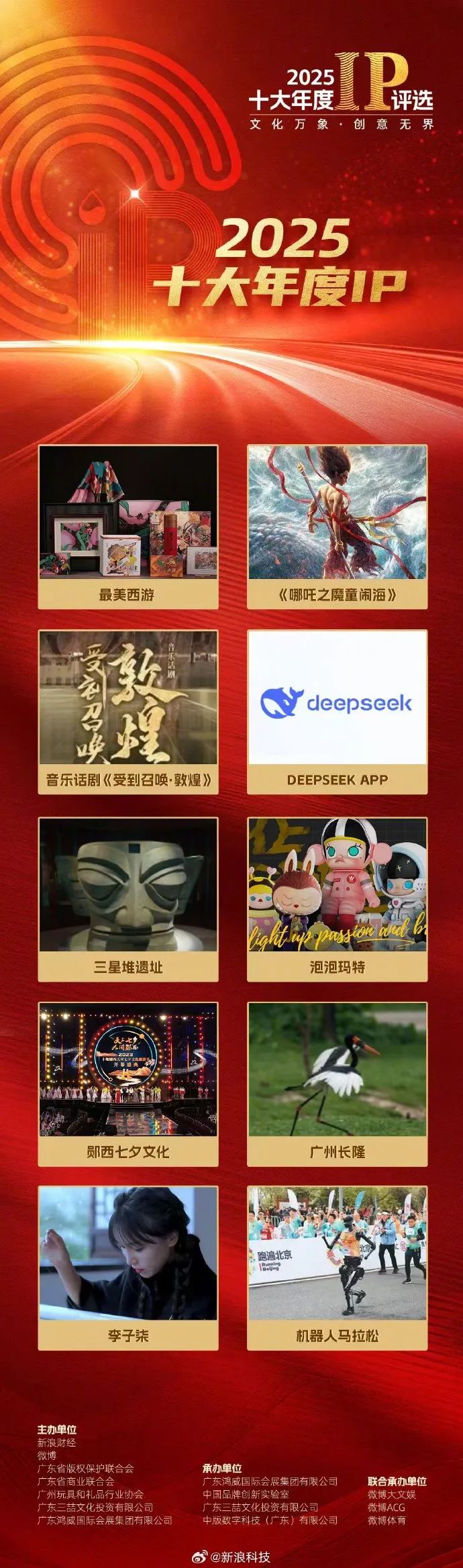 ● 综合专家评审与网络投票,2025十大年度IP重磅揭晓。《哪吒2》、deepseek、三星堆遗址、泡泡玛特、李子柒、机器人马拉松等入选。