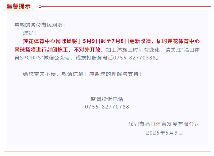 ●福田:莲花体育中心网球场5月9日起至7月8日不对外开放。