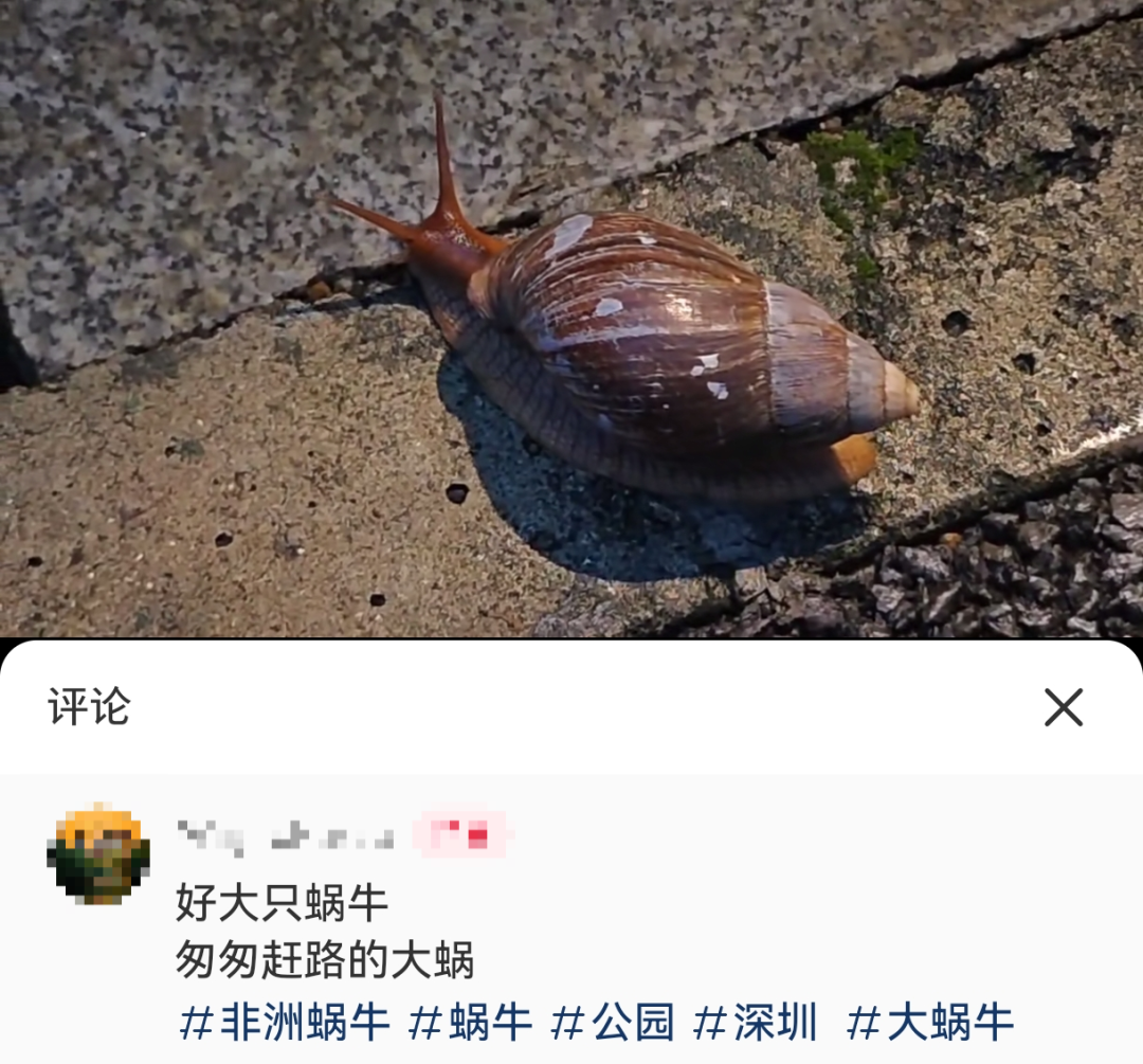 非洲大蜗牛,是我国首批16种外来入侵物种之一,喜欢吃农作物、林木、蔬菜和花卉等植物,可危害500多种作物。因其不能在水中存活,一旦下大雨,便会从躲藏处爬出。城市中,多见于公园草地、花坛、居民区的墙角边。