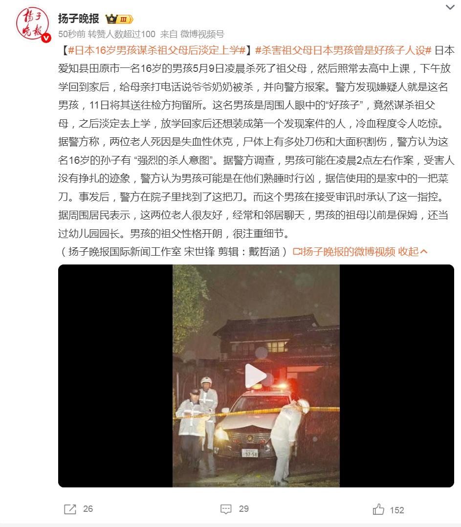 日本爱知县田原市一名16岁的男孩5月9日凌晨杀死了祖父母,然后照常去高中上课,下午放学回到家后,给母亲打电话说爷爷奶奶被杀,并向警方报案。警方发现嫌疑人就是这名男孩,11日将其送往检方拘留所。