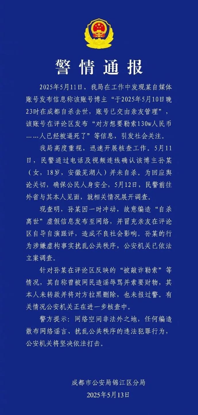 ● 5月13日凌晨,成都锦江公安发布警情通报百万粉丝网红疑遭勒索后自杀系自导自演。详情>>