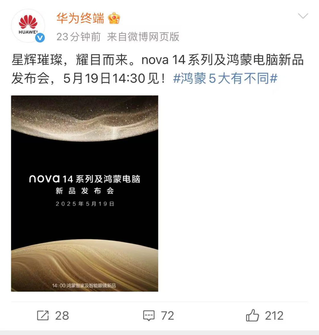 ● 5月13日,据华为终端微博消息,nova14系列及鸿蒙电脑新品发布会,5月19日14:30见。
