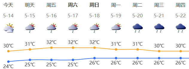 深圳今日多云,局地有短时阵雨;气温24-30℃;东风2-3级;相对湿度65%-90%。