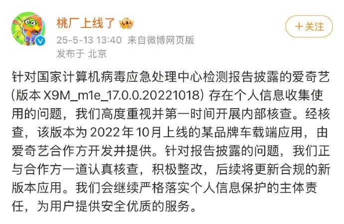 ● 5月13日,爱奇艺回应某版本违规收集个人信息,高度重视并第一时间开展内部核查。