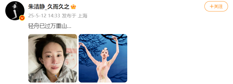 日前,知名舞蹈家、上海歌舞团演员朱洁静在社交平台账号晒出躺在病床上和舞台上的照片,写道“轻舟已过万重山”。