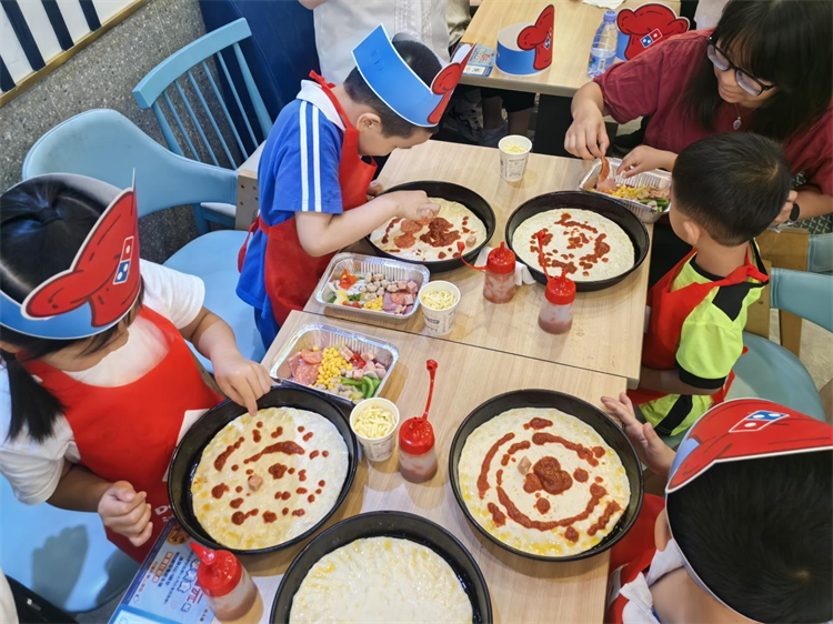 活动现场,在专业厨师的示范指导下,孩子们系上达美乐特制小围裙,化身“小小主厨”。揉面团时专注的眼神,涂抹酱料时小心翼翼地动作,摆放食材时天马行空的创意,每个环节都成为亲子互动的温馨时刻。当自闭症儿童小宇将配料创意性的装饰在披萨边缘时,他妈妈激动地说:“很难得看到他愿意主动尝试做事情,看来他很喜欢今天的活动。”