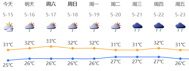 深圳今日多云,局地有(雷)阵雨;气温25-31℃;东南风2-3级;相对湿度70%-95%。