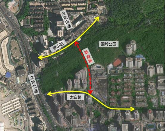 翠金路规划为一条长约336米的道路,拟采用隧道方式穿越围岭公园,其南北两端分别衔接罗湖太白路和翠山路,隧道道路宽15米,设计为双向2车道,两侧还敷设有人行道和非机动车道。