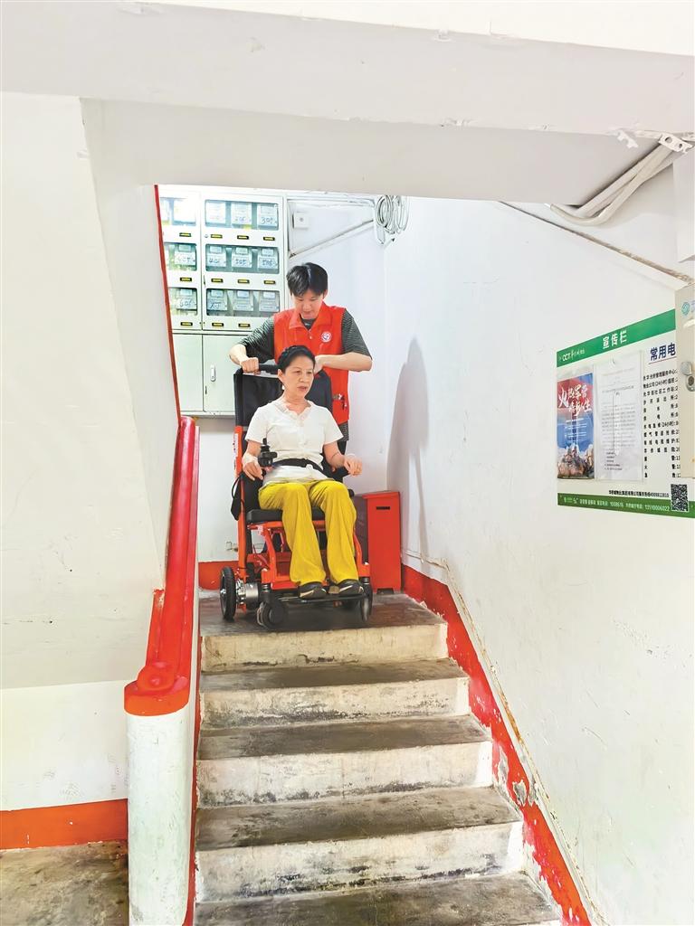 该社区相关负责人告诉记者,辖区近半是老旧小区楼梯房,且居住老年人群体多,电动爬楼机无疑给他们带来了巨大便利。“以前需要四个人把一个轮椅抬上楼,现在1~2人就能辅助完成,整个过程轻松很多。”