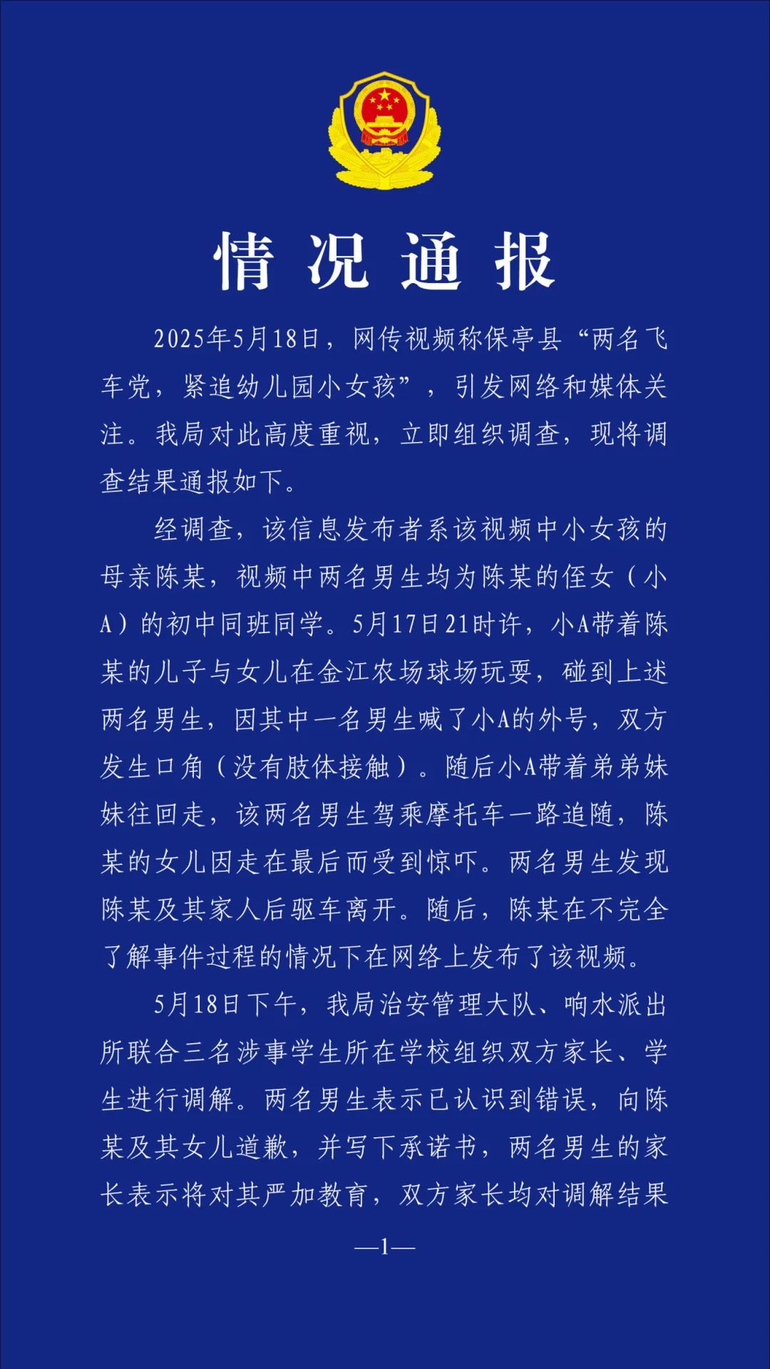 2025年5月18日,网传视频称保亭县“两名飞车党,紧追幼儿园小女孩”,引发网络和媒体关注。我局对此高度重视,立即组织调查,现将调查结果通报如下。