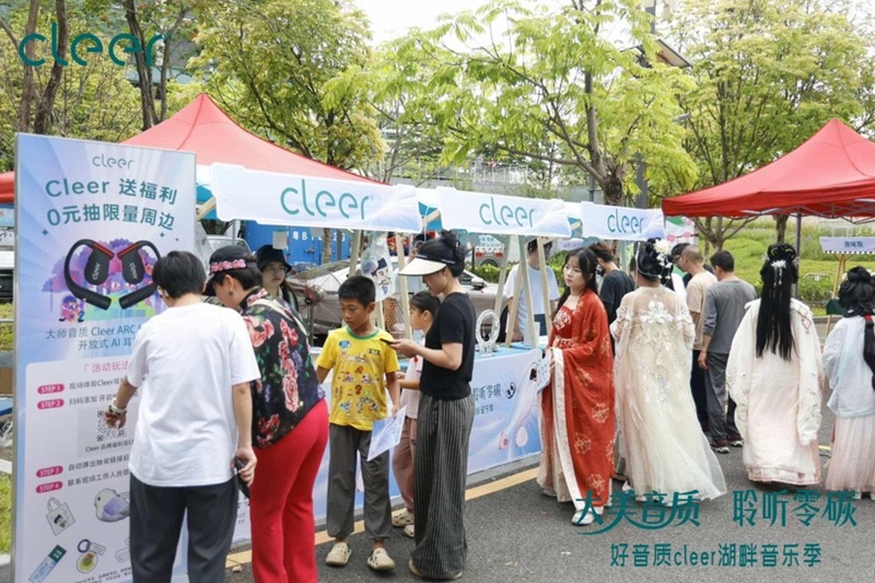 活动现场,湖光潋滟中乐声悠扬,手拍鼓的热情节奏、电子乐队的激情弹唱、热辣舞蹈的动感演绎轮番登场;维斯乐团的经典热歌连唱引发全场共鸣;而汉服模特手持Cleer耳机环湖走秀,则将传统东方美学与现代科技完美融合,营造出“湖光映音符·音浪撼人心”的独特艺术氛围。