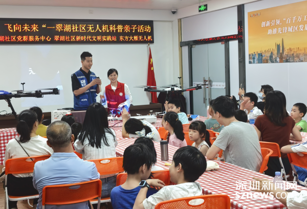 深圳新闻网2025年5月20日讯(记者 蔡雄彬 通讯员 巫燕芳)为推动青少年科技素养培育,搭建亲子互动实践平台,5月18日,在翠湖社区党委大力支持下,翠湖社区党群服务中心、社区新时代文明实践站联合东方大雁科技无人机公司,开展 “筑梦科技,飞向未来” 无人机科普亲子活动。这场集知识普及与实操体验于一体的特色活动,吸引了社区20组家庭积极参与,以科技之光点亮青少年创新梦想。