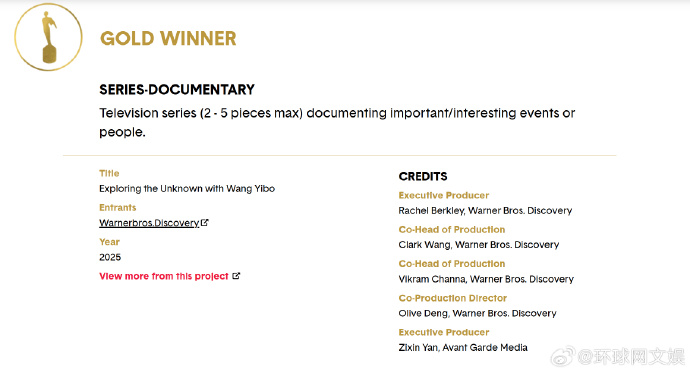 ● 5月21日,有“美国电视界奥斯卡”之称的泰利奖( Telly Awards)公布2025年获奖名单,由王一博主演的纪录片《探索新境》获得金奖。
