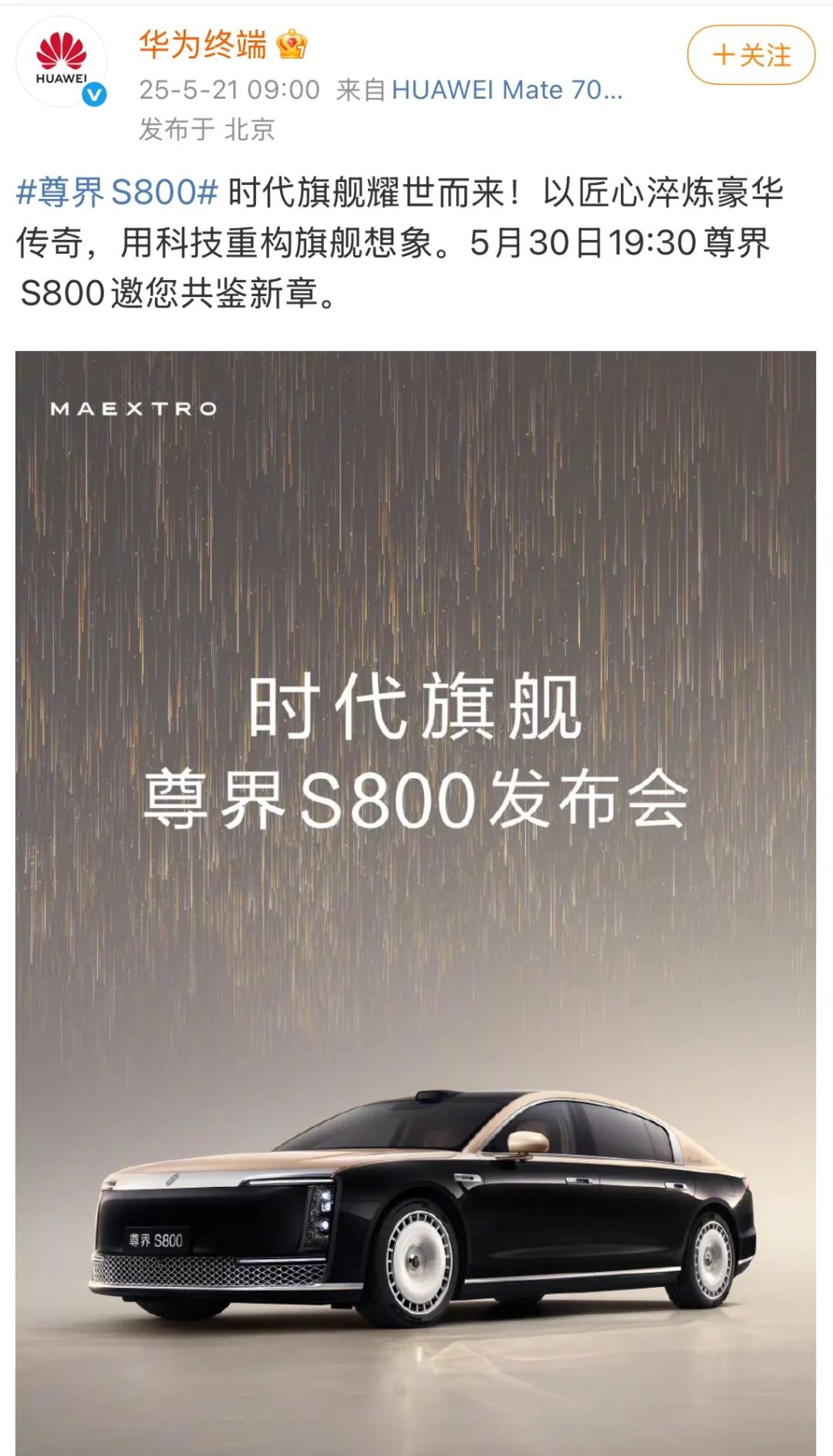● 5月21日,华为终端宣布,将于5月30日19:30举行尊界S800发布会。
