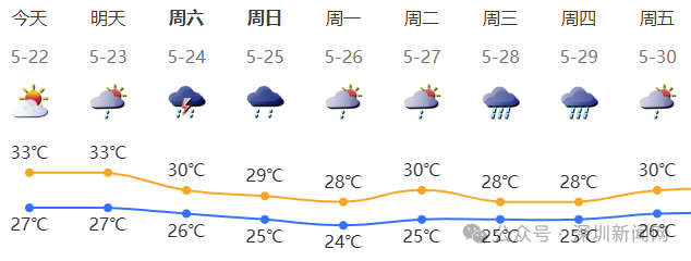 深圳今日多云间晴天,局地有短时(雷)阵雨;气温27-33℃;南风2-3级,沿海、高地和海区阵风6级;相对湿度60%-85%。
