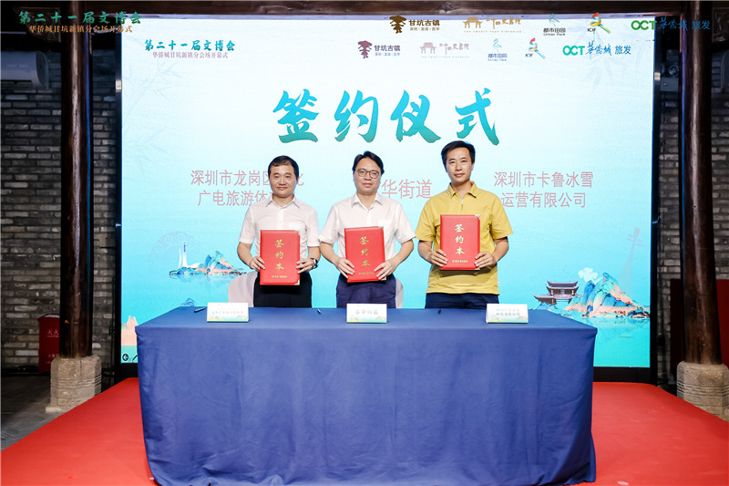 活动现场还举行了“甘坑新镇卡鲁冰雪世界”项目战略合作框架协议签约仪式,由深圳市龙岗区文化广电旅游体育局、深圳市龙岗区吉华街道办事处与深圳卡鲁冰雪运营有限公司三方共同签署。
