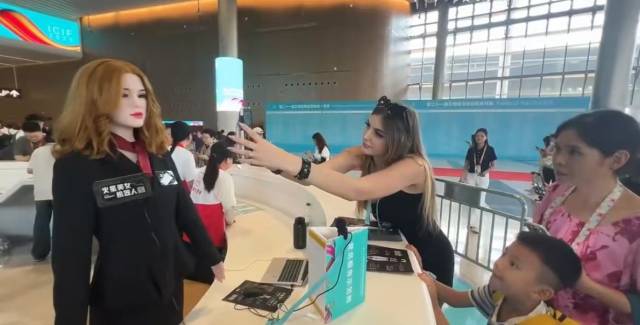 在问询处,“她”凭借引流导览、唱歌跳舞、互动对话等多项功能受到众多观众瞩目,不少外国展商争相与之合照。