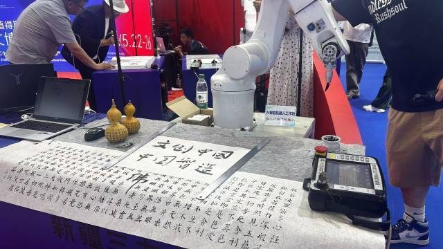 谁说机器人不懂艺术?文博会现场来自新疆三力智造的这台机械臂写书法、画国画,1.5毫米的微楷也不在话下。