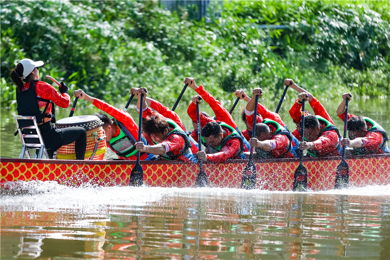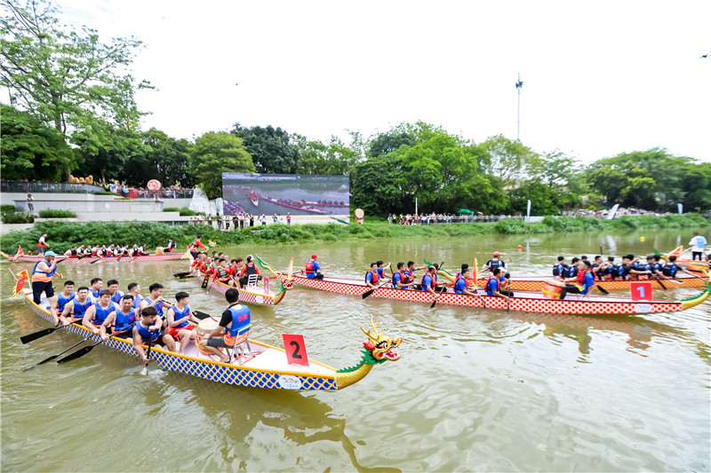 16支龙舟队意气风发,逐一亮相。比赛开始,龙舟在河面一字排开,随着发令枪响,龙岗河瞬间被点燃。“咚咚咚……”鼓手有力的鼓点响起,选手们齐声高呼口号,将手中的船桨整齐地划动,龙舟如离弦之箭,在水面上飞速驰骋,激起层层浪花。龙舟如同矫健的巨龙,迎着风浪奔腾而去。选手们整齐划一的节奏与默契配合,展现出龙舟运动独有的力量与美感。