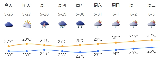周五(30日)降雨减弱;周六到周日(31-6月1日)多云,间中有短时(雷)阵雨天气。