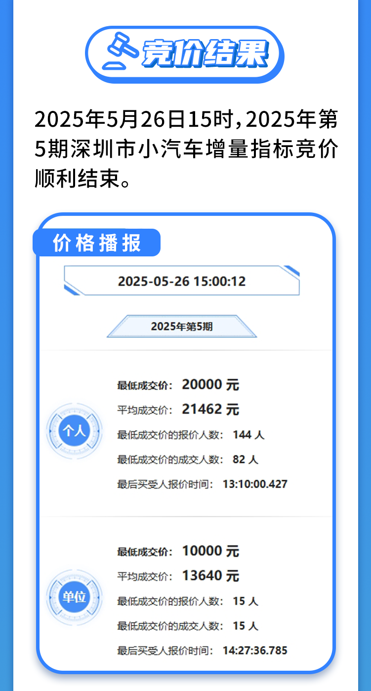 ● 2025年第5期粤B指标竞价结果出炉:本期个人车牌最低成交价20000元,平均成交价21462元;单位车牌最低成交价10000元,平均成交价13640元。