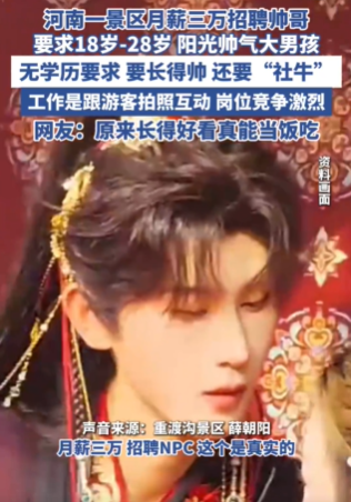 ● 近日,河南重渡沟景区月薪3万元招帅哥NPC,景区回应:日常工作主要是跟游客拍照互动。