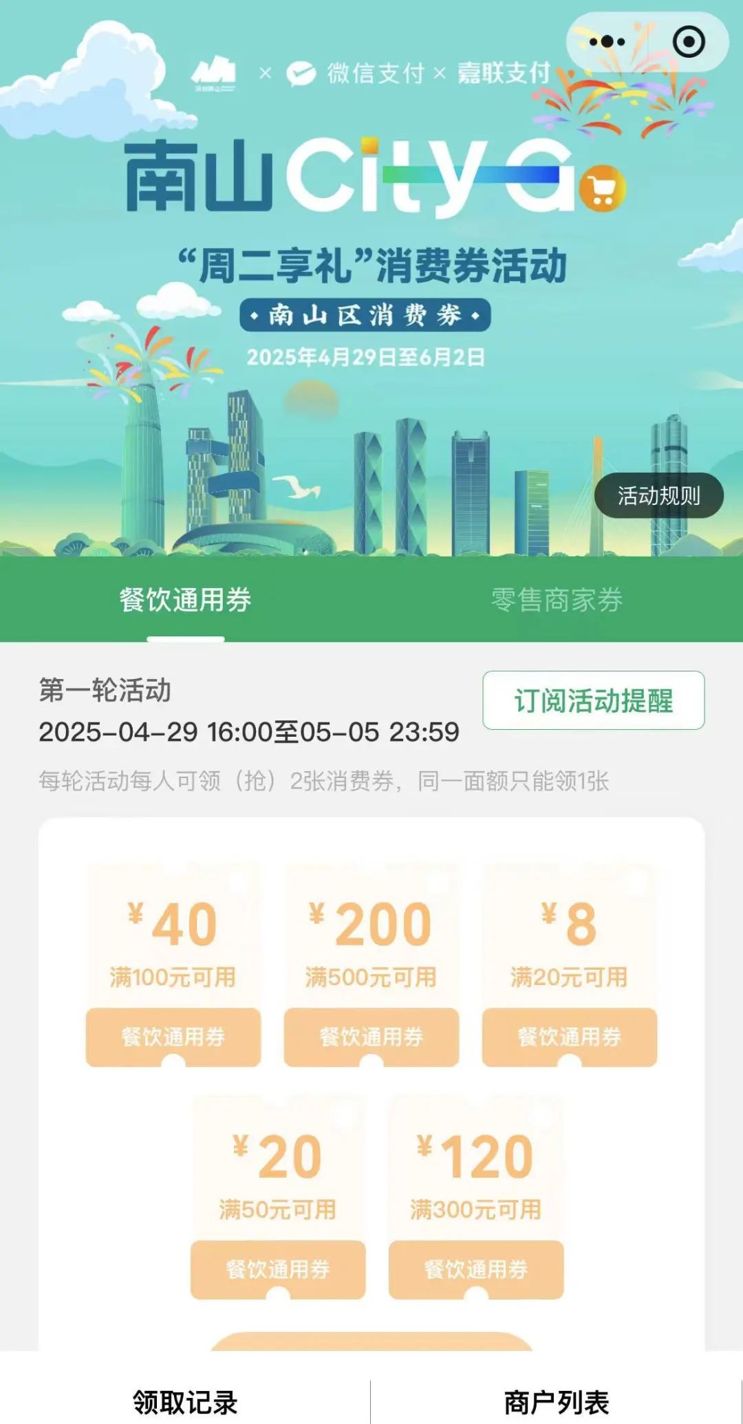 注意:消费券采用“在线领券”的方式进行发放,用户参与活动时,所使用的设备实时地理位置定位必须在深圳市内,且用户需已完成微信支付实名认证。
