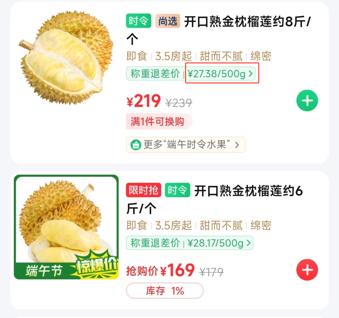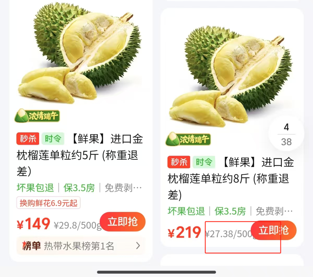 5月27日,小新查询发现朴朴超市和小象超市的泰国金枕榴莲最低价格均为27.38元/斤。据媒体报道,5月8日,朴朴超市的泰国金枕榴莲最低价格折合35.82元/斤,小象超市的泰国金枕榴莲秒杀价折合37.8元/斤。