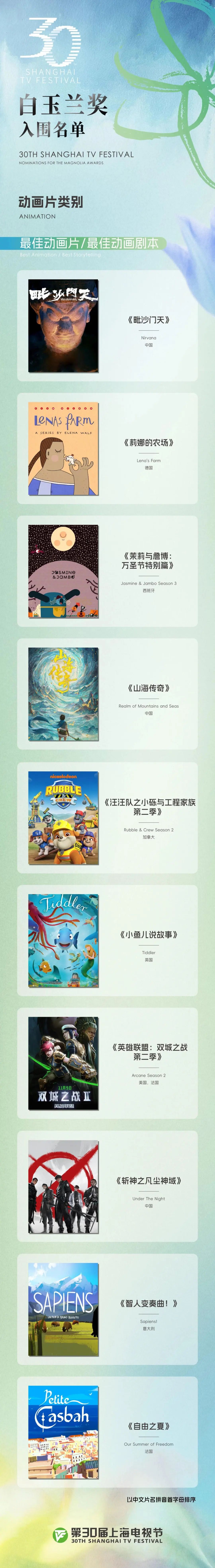 ●第30届上海电视节白玉兰奖入围名单(纪录片/动画片类别)公布,奖项将于6月27日“白玉兰绽放”颁奖典礼揭晓。