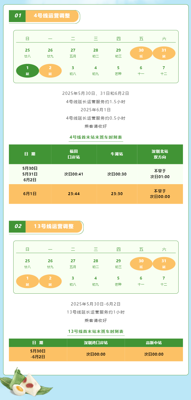 ● 为满足市民在即将到来的端午假期的出行需求,地铁4号线和13号线将延长运营服务时间。