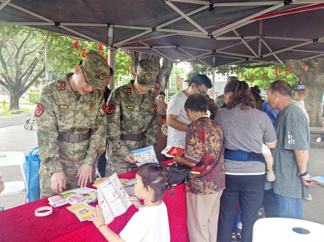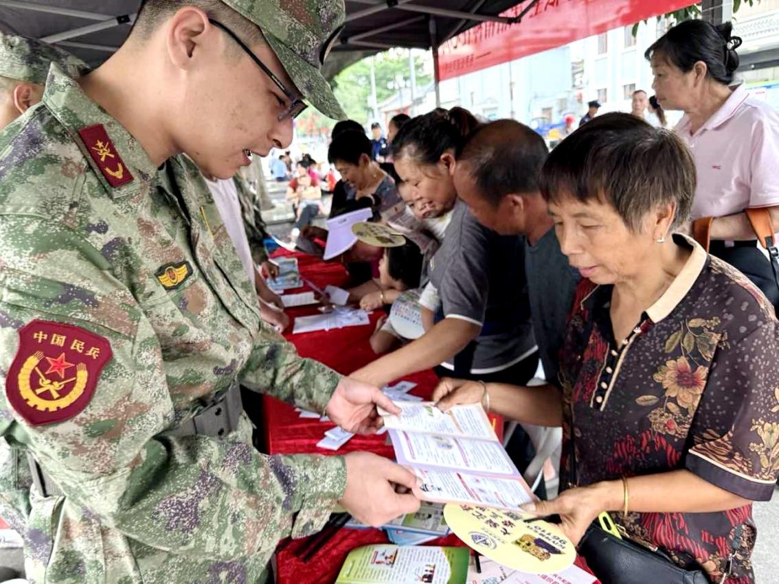 活动现场,身着迷彩服的街道民兵成为一道亮眼的风景线。他们不仅负责维持秩序、保障安全,还化身普法志愿者,向过往居民发放民法典宣传手册,耐心解答法律问题。“看到民兵同志们在,我们觉得特别安心!”带着孩子参加活动的赖阿姨笑着说道。民兵的参与既体现了军民融合的深度,也让普法宣传多了几分亲和力。
