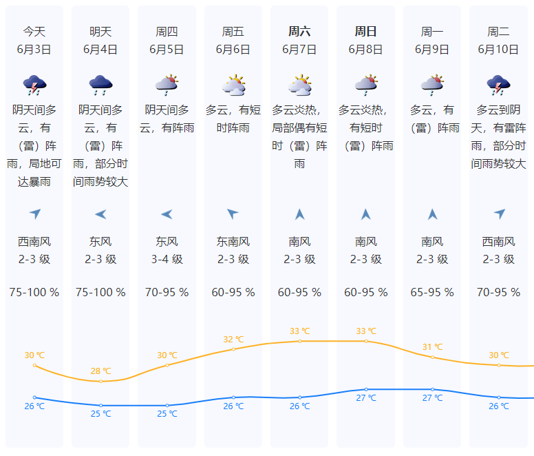 6月3日,珠江三角洲南部、粤东市县有大雨局部暴雨或大暴雨,雷雨时伴有8级左右的雷暴大风,其余市县有(雷)阵雨局部大雨。最高气温:粤北市县26℃—27℃,粤西市县31℃—33℃,其余市县28℃—30℃。