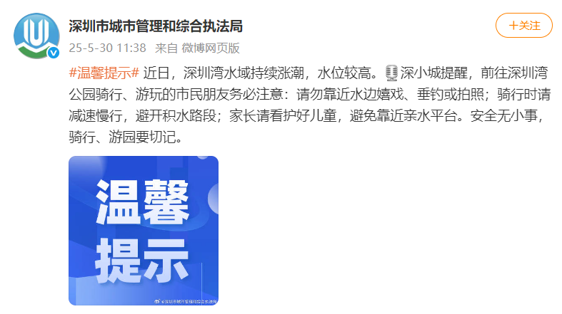 ● 深圳湾海岸水位高涨,漫上部分骑行道?深圳城管发布重要提醒。详情>>
