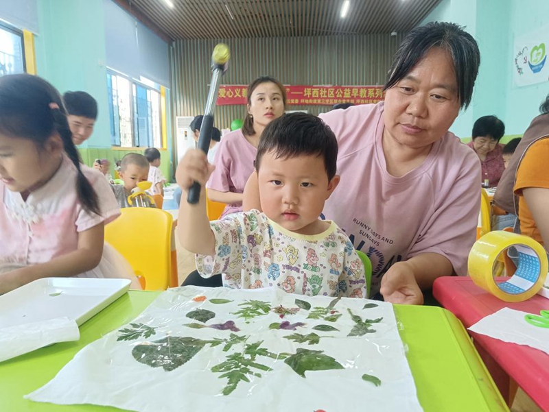 坪西社区于5月28日下午联动香林世纪华府幼儿园举办“童心绘自然·植物拓染”公益早教活动,15组亲子家庭参与其中。活动现场,孩子们在家长陪伴下挑选花瓣叶片,亲手敲打出一幅幅色彩斑斓、充满童趣的拓染画作,在动手实践中感受自然之美与传统工艺的魅力。