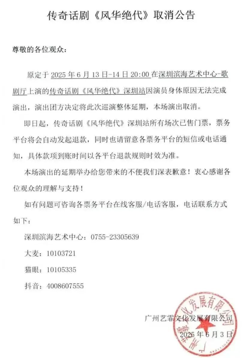 《风华绝代》深圳站演出取消