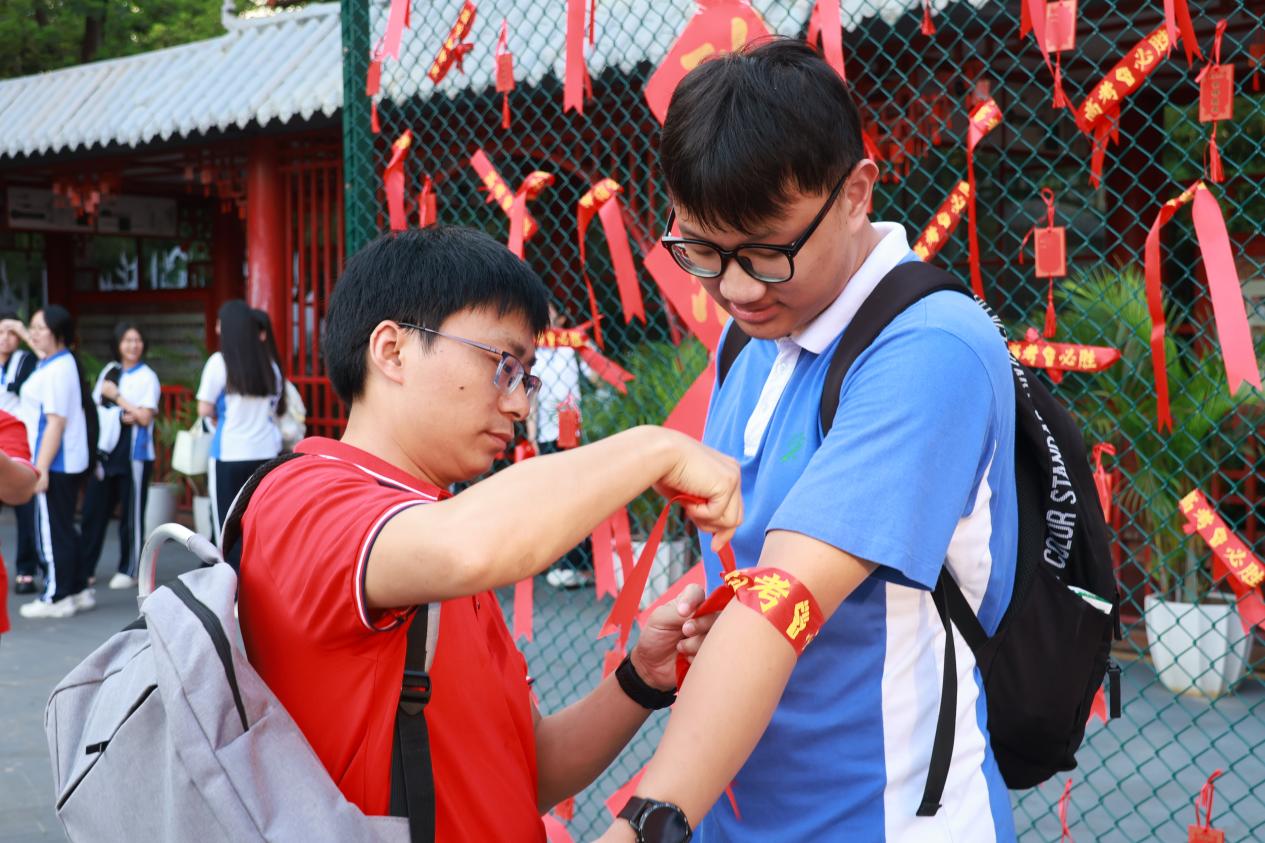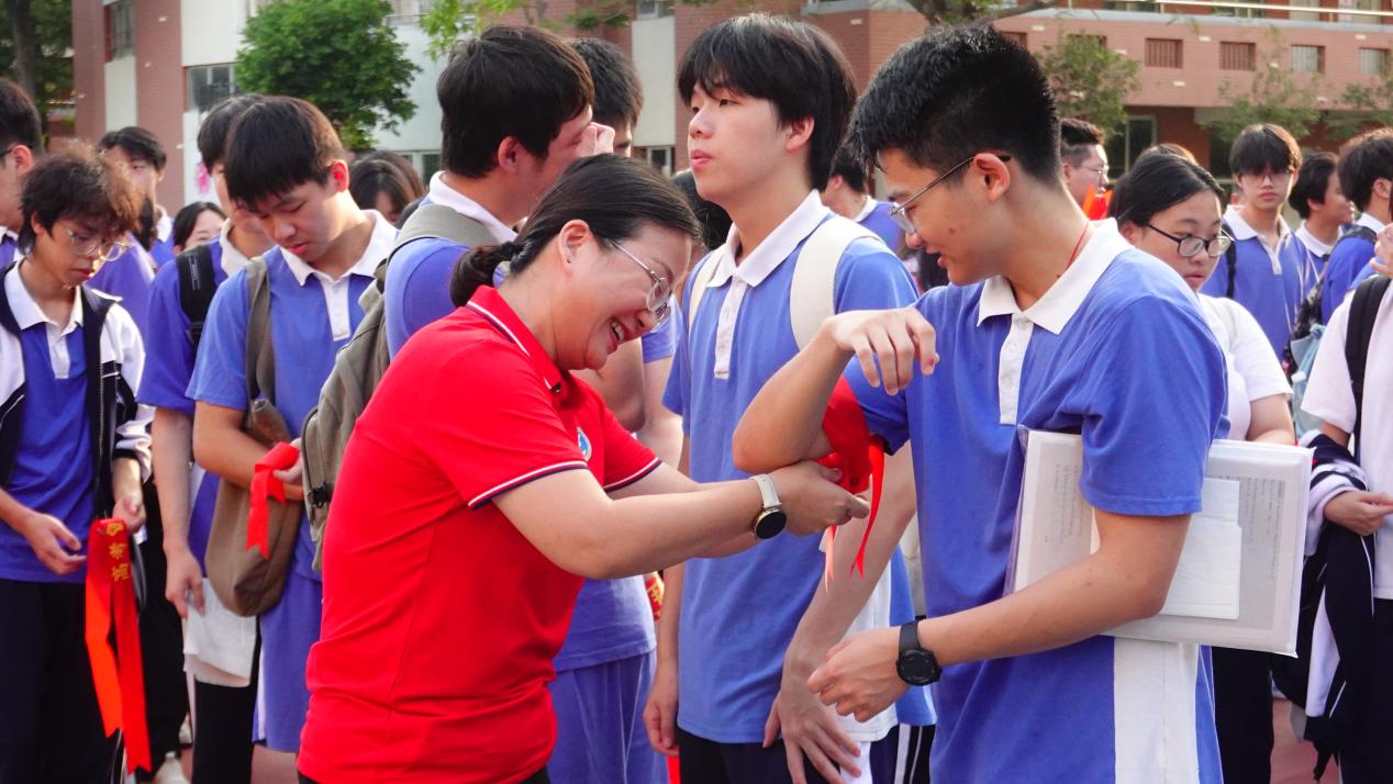 在汇聚磅礴力量的声声呐喊中,校长们牵着高三学子,迈着坚定而轻快的步伐走向新征程。一双双来自老师、家长的温暖手掌早已伸出,清脆有力的击掌声此起彼伏,这不仅是简单的肢体触碰,更是力量的传递、信念的共鸣。学校为学子们送上深情寄语:“愿胸怀山河的少年,执笔为刃,在远阔的征途上披荆斩棘,亲手点亮属于你们的星辰灯火!”